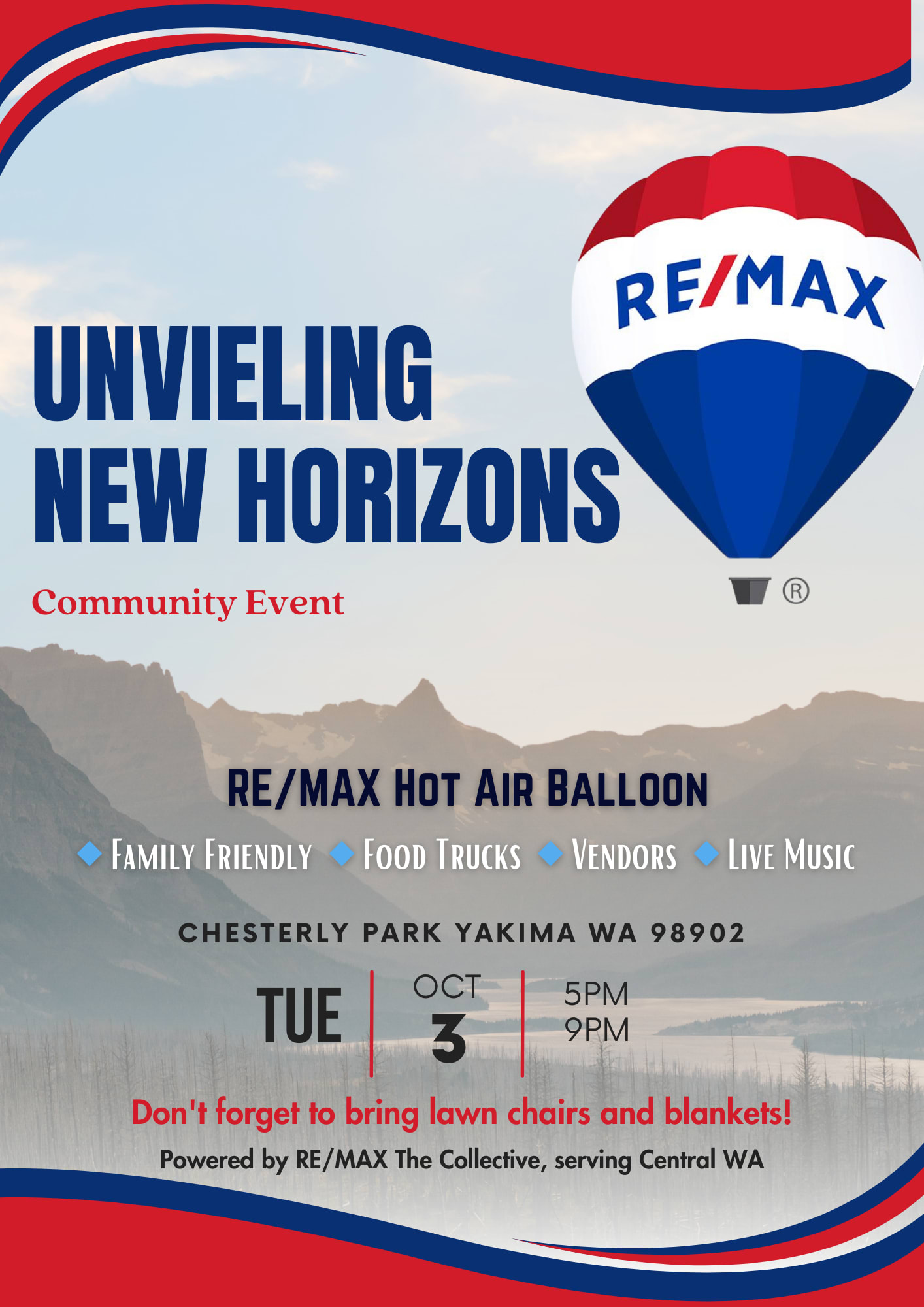 Unveil new horizons with Re/Max The Collective! A family friendly event with food trucks, vendors, live music and a real RE/MAX HOT AIR BALLOON!! Bring your lawn chairs and blankets and enjoy this fun community event.