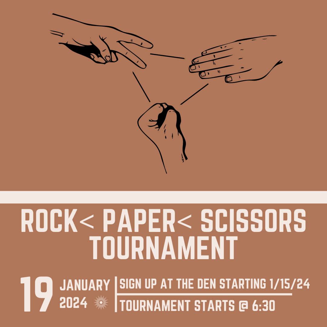 Prepare for a night of strategic throws and epic clashes at our Rock Paper Scissors Tournament! 🤜📄✂️ Jan 19th from 6:30-9 pm. Stop by the Den to sign up for the tournament starting Monday, 1/15, and compete for the ultimate prize! Special draft options and a menu featuring delicious appetizers – stay tuned for more details – let the games begin!