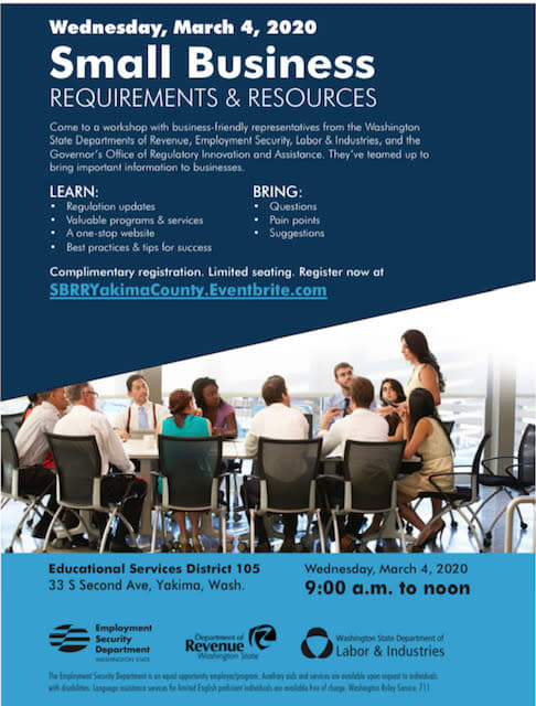 RESOURCESCome to a workshop with business-friendly representatives from the Washington State Departments of Revenue, Employment Security, Labor & Industries, and the Governor’s Office of Regulatory Innovation and Assistance. They’ve teamed up to bring important information to businesses. LEARN: • Regulation updates • Valuable programs & services • A one-stop website • Best practices & tips for success BRING: • Questions • Pain points • Suggestions
